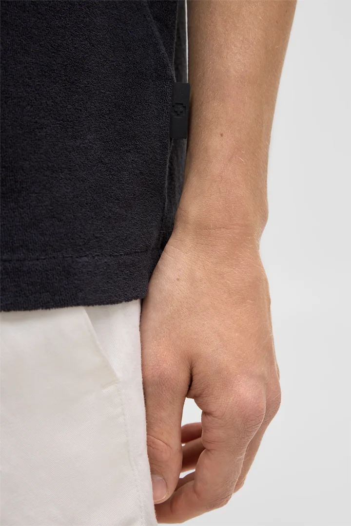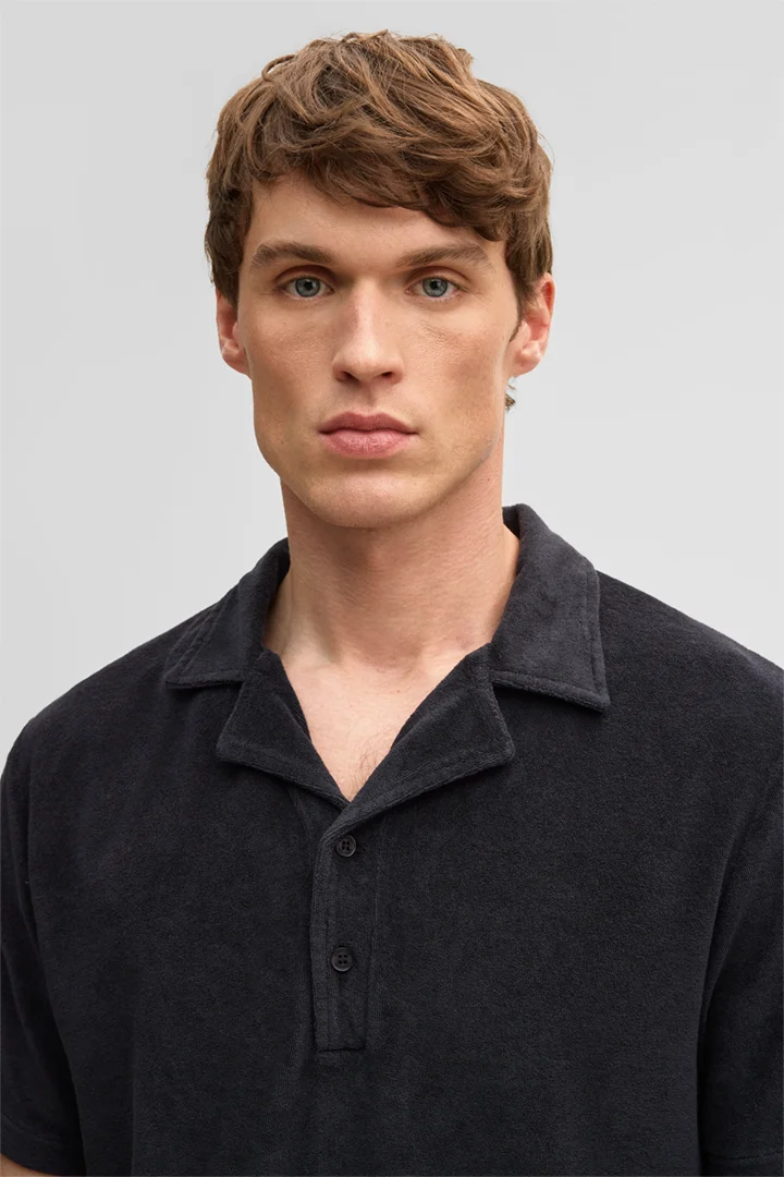 Komfortabler Allrounder: das Poloshirt Joseph in Frottee-Verarbeitung mit kurzer Knopfleiste und Rubber-Logo-Flag.