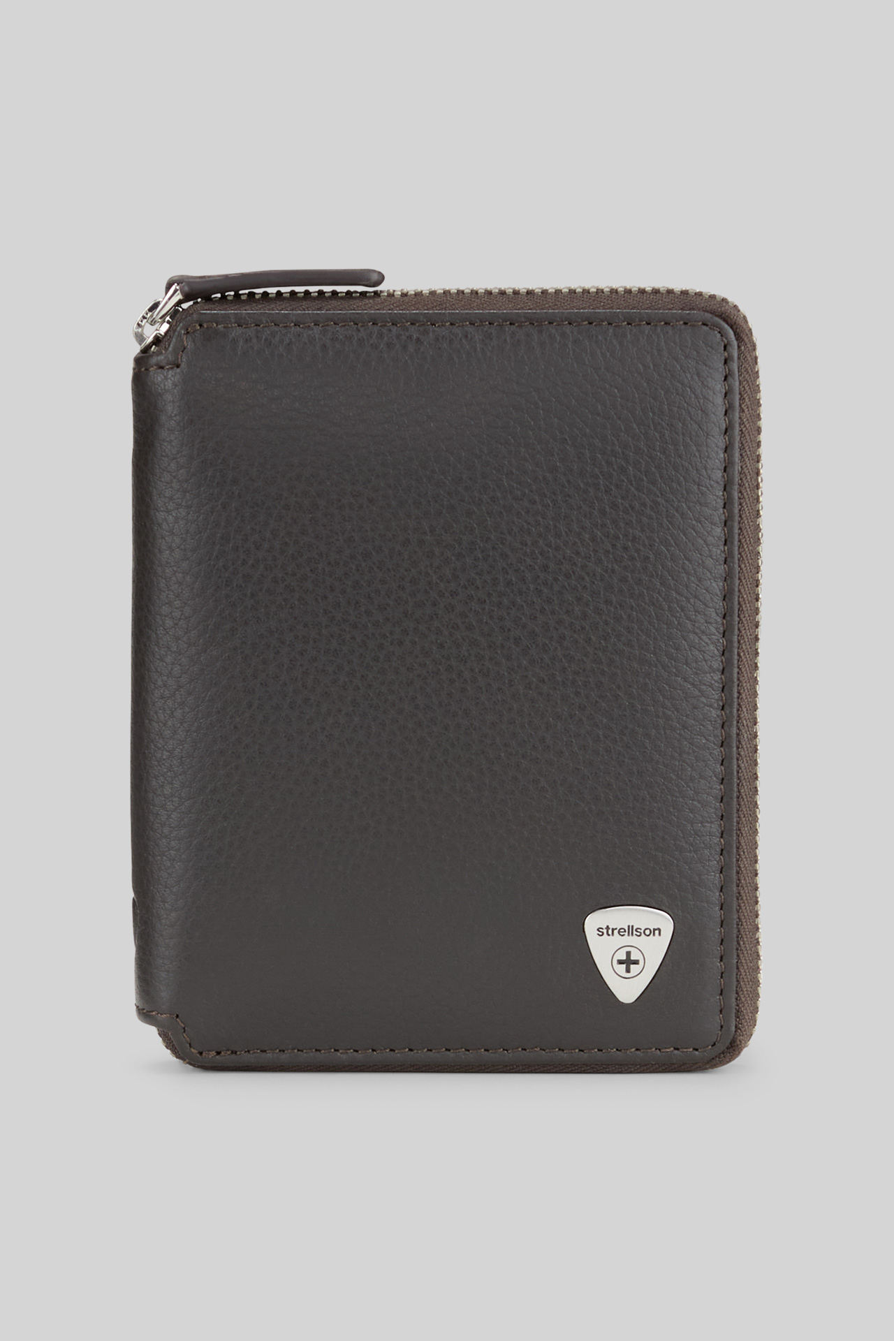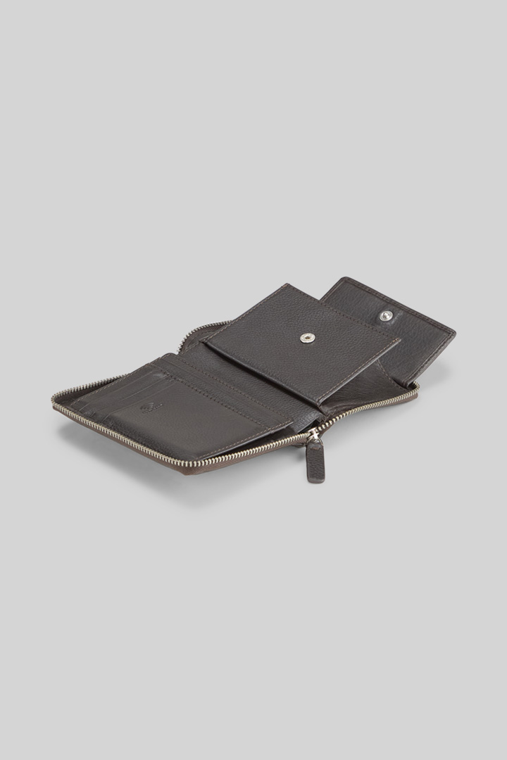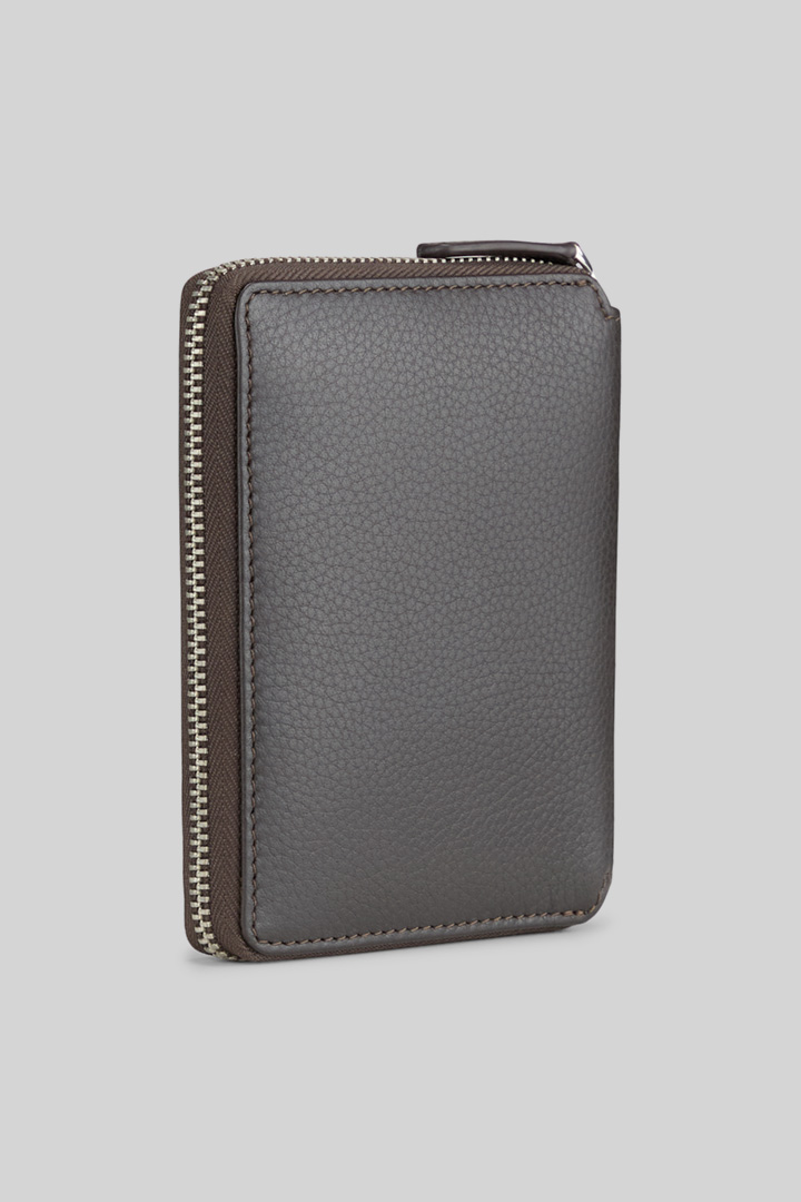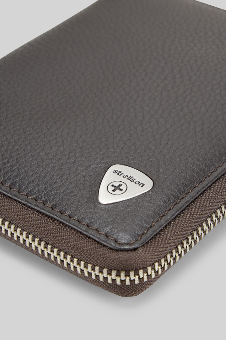 Stilvoll mit Zip-Verschluss und ikonischer Label-Plakette: die Geldbörse Harrison aus genarbtem Leder. Diverse Steck- und Kartenfächer, extra Münzfach und integriertes RFID-Safe-System.