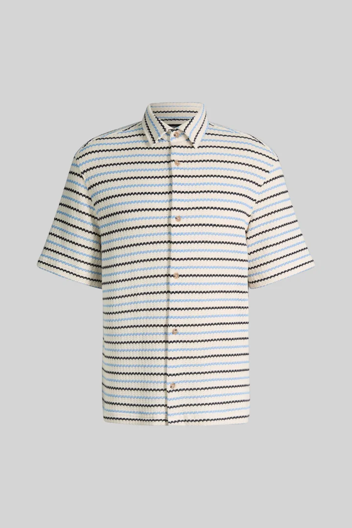 Im kontrastiven Strukturmuster erhält das kurzärmelige Hemd Colin den ausdrucksstarken Look. Puren Komfort bietet die Verarbeitung aus Baumwollmischung mit Viskose. Eine durchgängige Knopfleiste und der Hemdkragen runden das Piece präzise ab. Der Style wirkt easy für die Freizeit und ist perfekt für sommerliche Tage.
