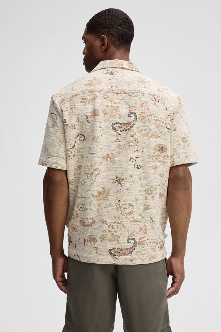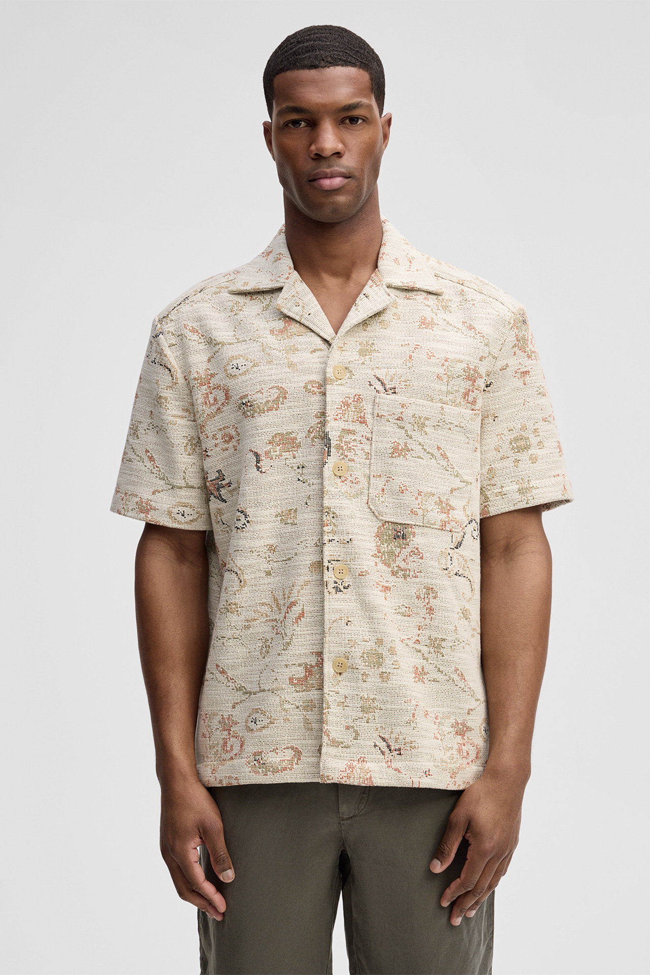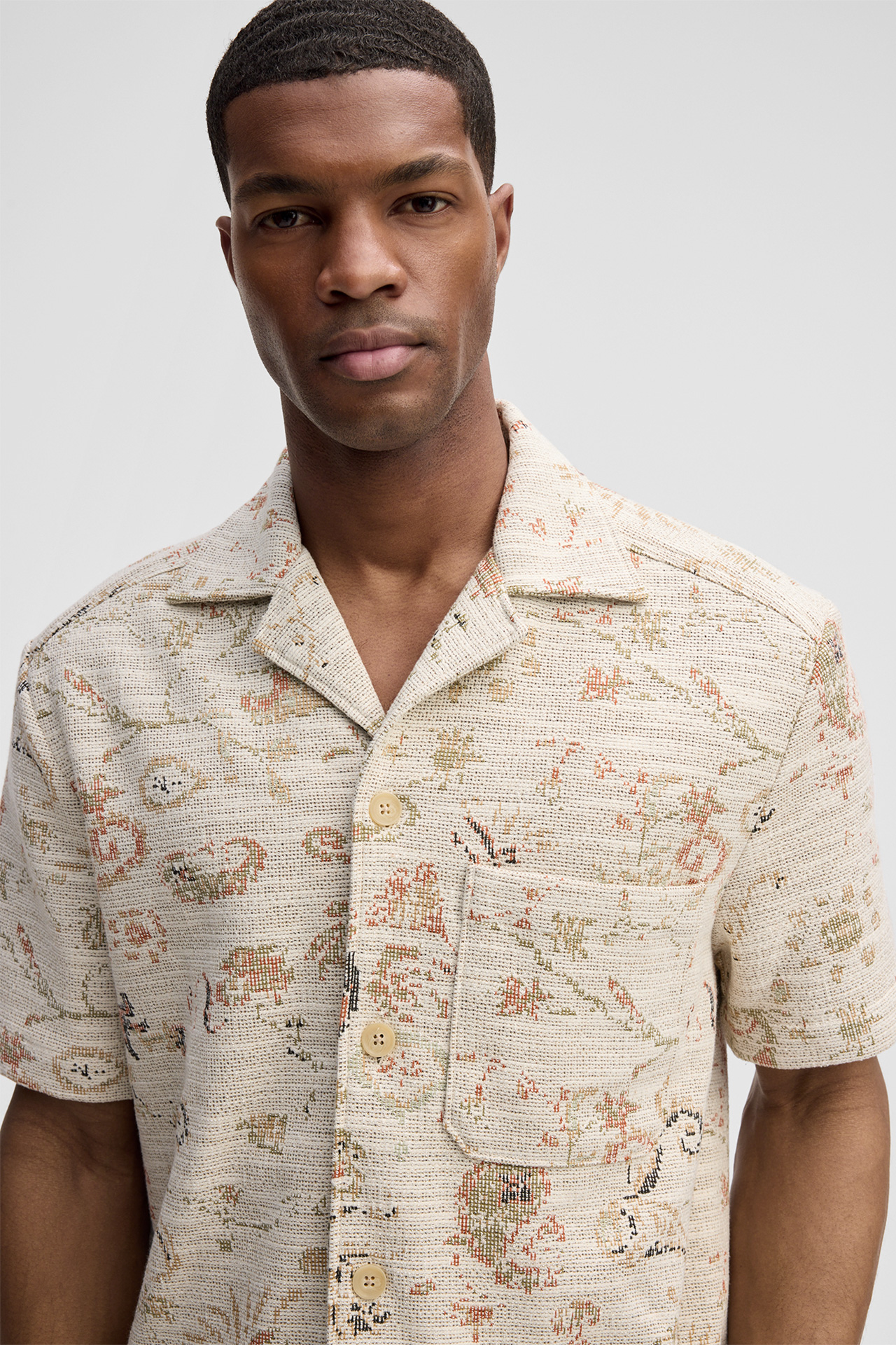 Im Jacquard-Design präsentiert sich das Kurzarm-Hemd Nohan als ausdrucksstarker Look. Der Reverskragen, die durchgängige Knopfleiste und eine Brusttasche verleihen Akzente. Das Piece ist ideal für moderne Freizeitoutfits und sommerliche Styles.