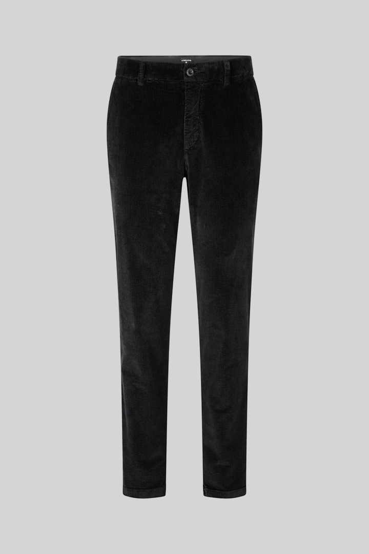Cordhose Rion in cleaner Optik mit nahtverdeckten Leistentaschen und verdecktem Zip-Verschluss. Gürtelschlaufen am Bund und ein Logo-Pin runden das Piece ab. Aus Baumwollstretch.