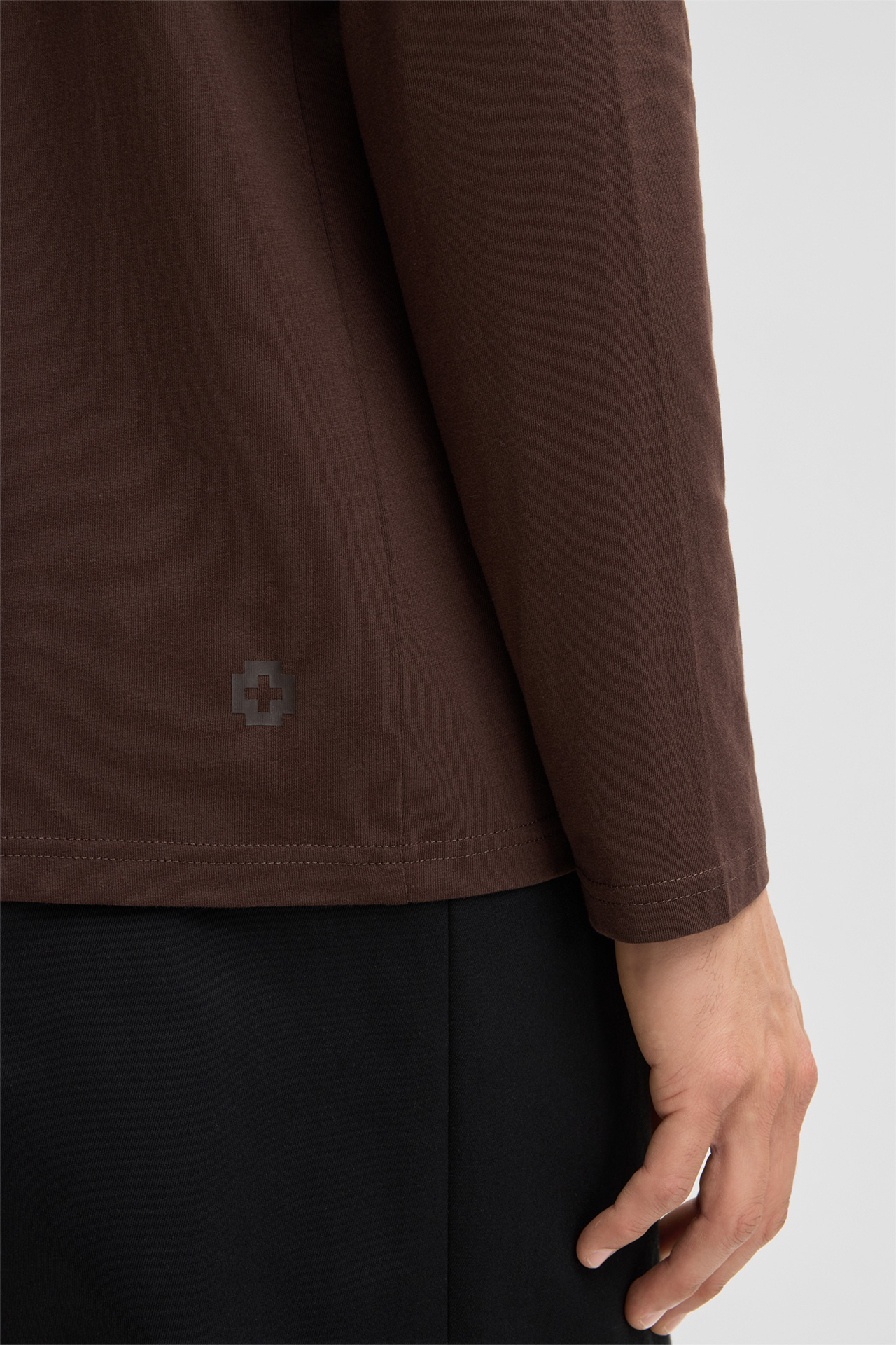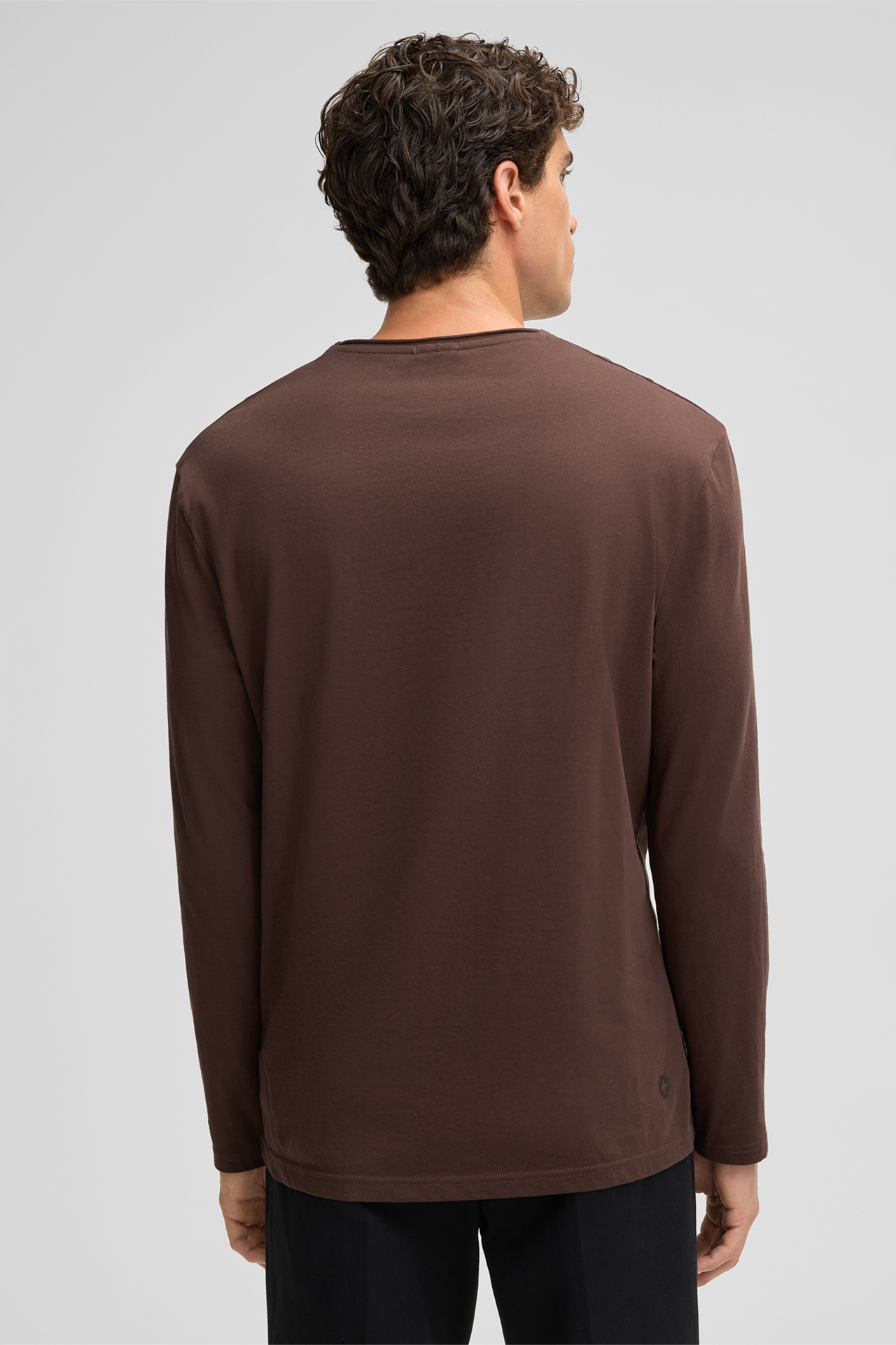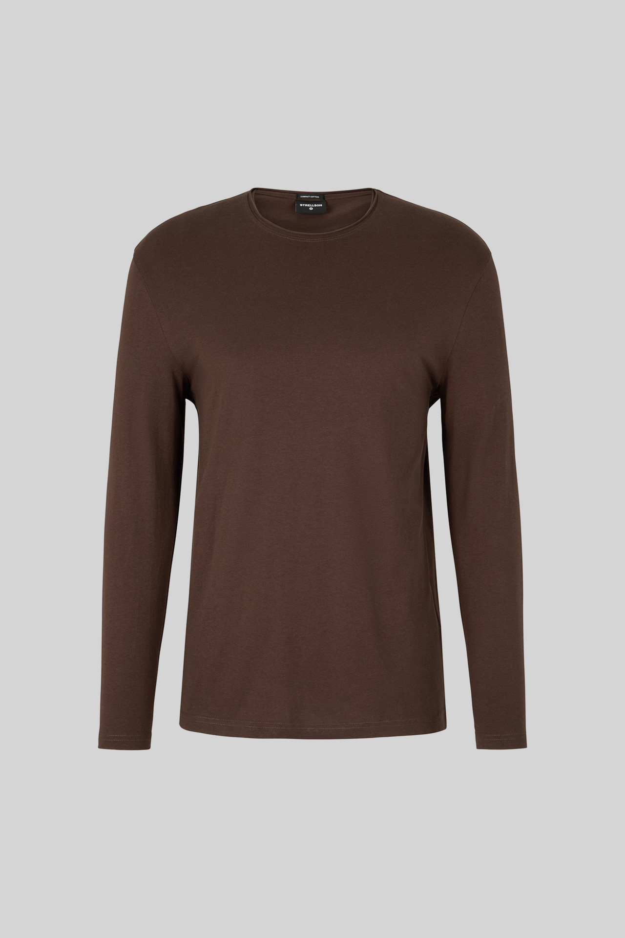 Perfektes Layering-Match: das Longsleeve Tyler aus reiner Baumwolle mit Rollsaumkante am Rundhalsausschnitt, ergänzt durch ein rückseitiges Rubber-Patch.