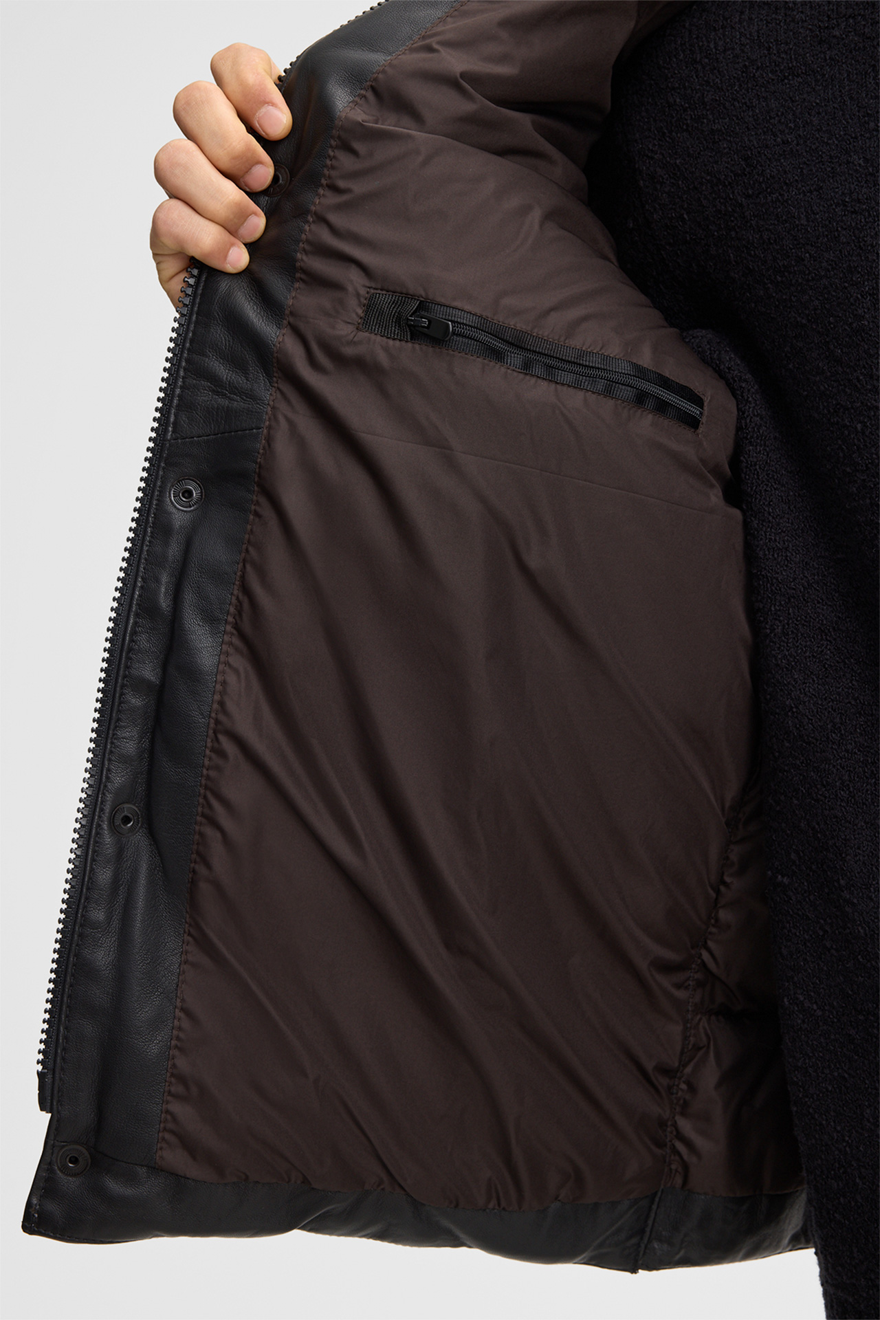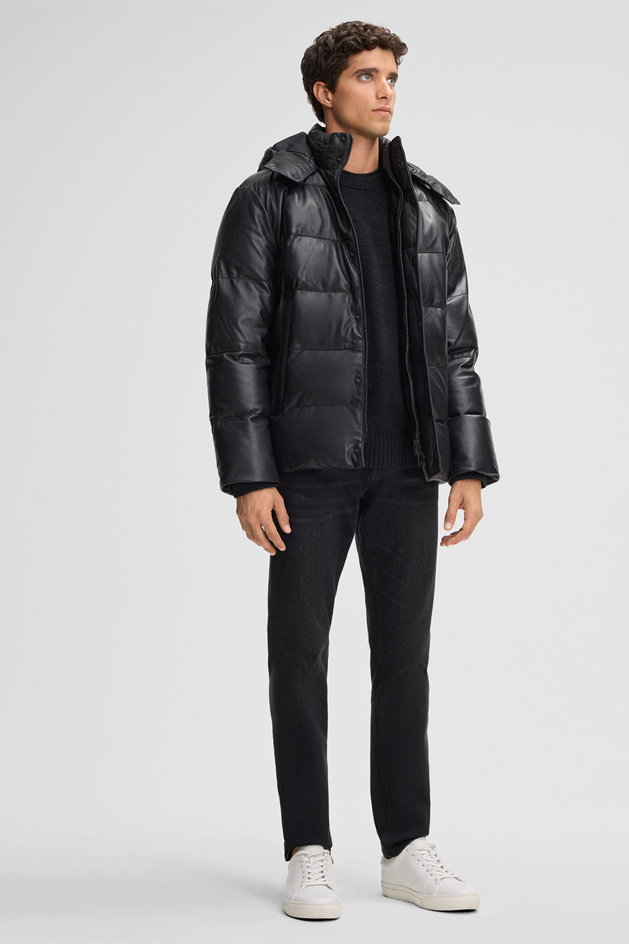 The Bodio leather jacket showcases a quilted look. Design with stand-up collar and drawstring, logo snap buttons and side pockets.