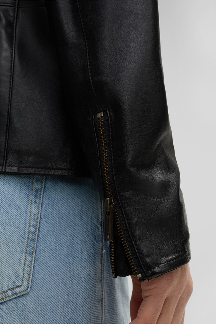 The Kellan leather jacket boasts a casual biker style with adjustable cuffs, a zip fastening and zipped pockets. Modern finish: the turn-down collar. This piece flaunts a soft lambskin nappa finish.