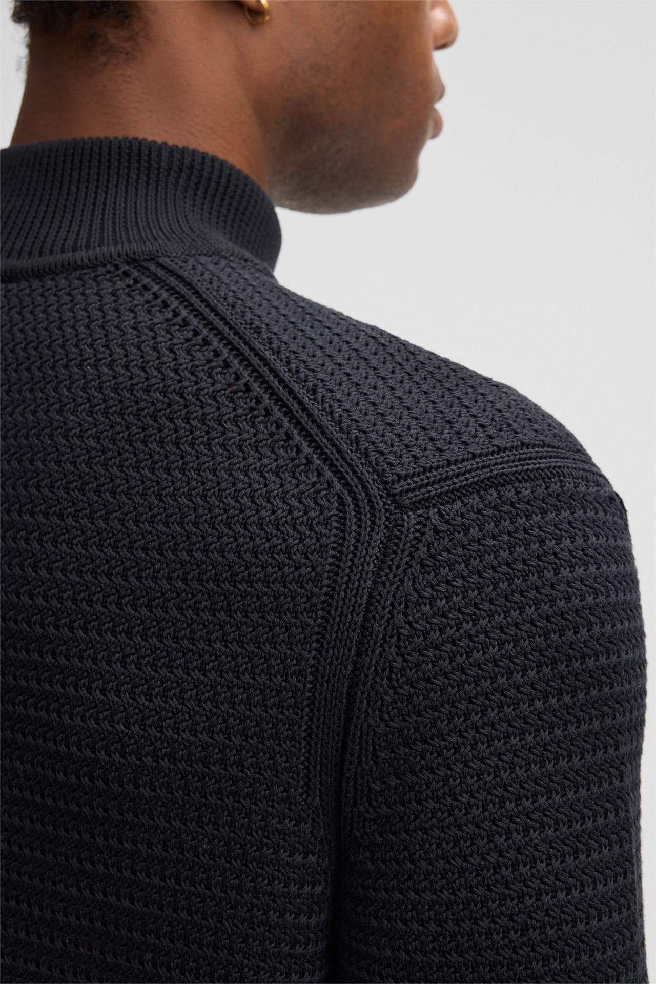 With a zipped stand-up collar in a Troyer design: The Adrian pullover excels in this textured design made of pure cotton. Ribbed cuffs complement the look.