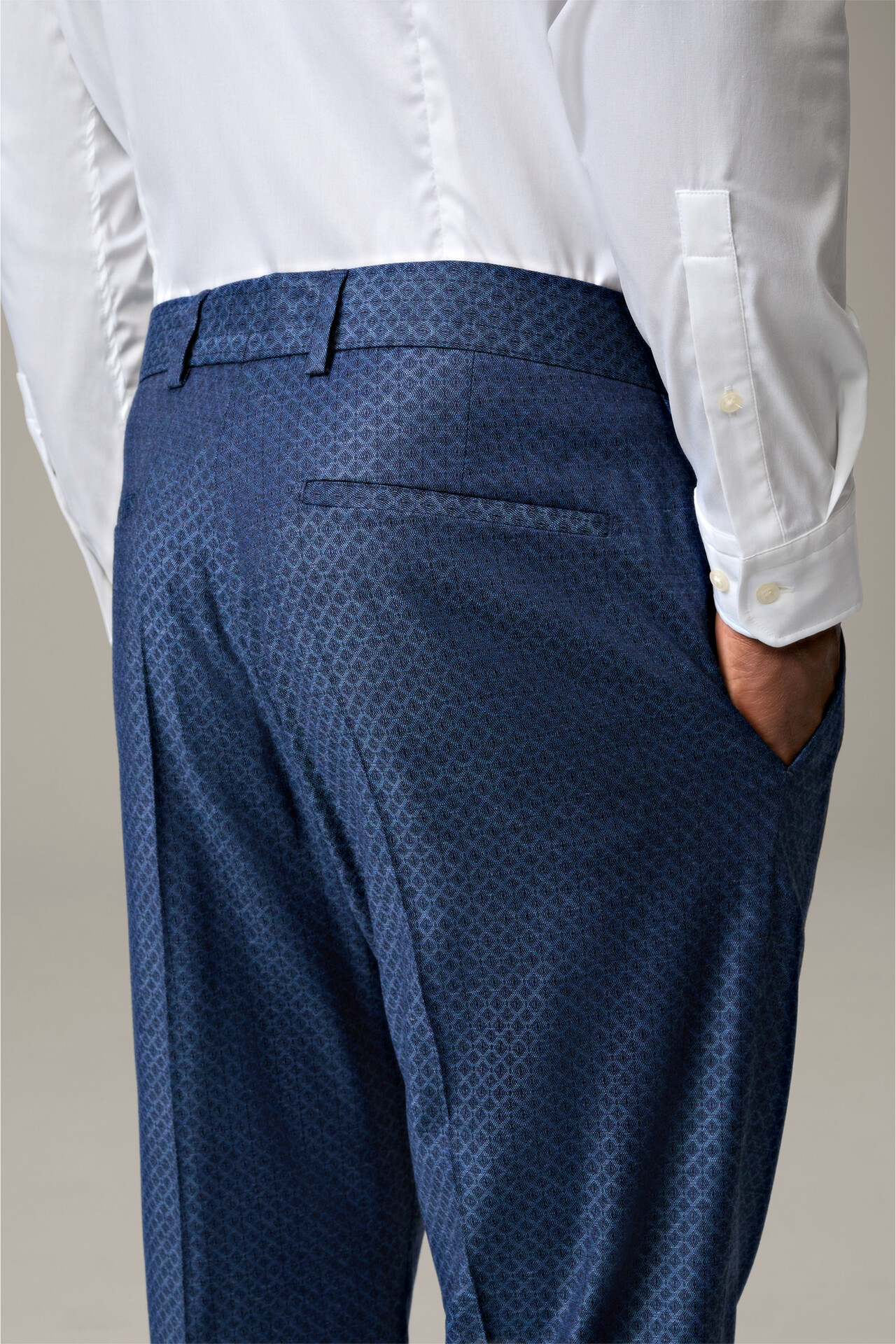 Eye-catching: the Luc suit trousers in a geometric all-over pattern. Fixed turn-ups and welt back pockets complement the look. Relaxed fit.